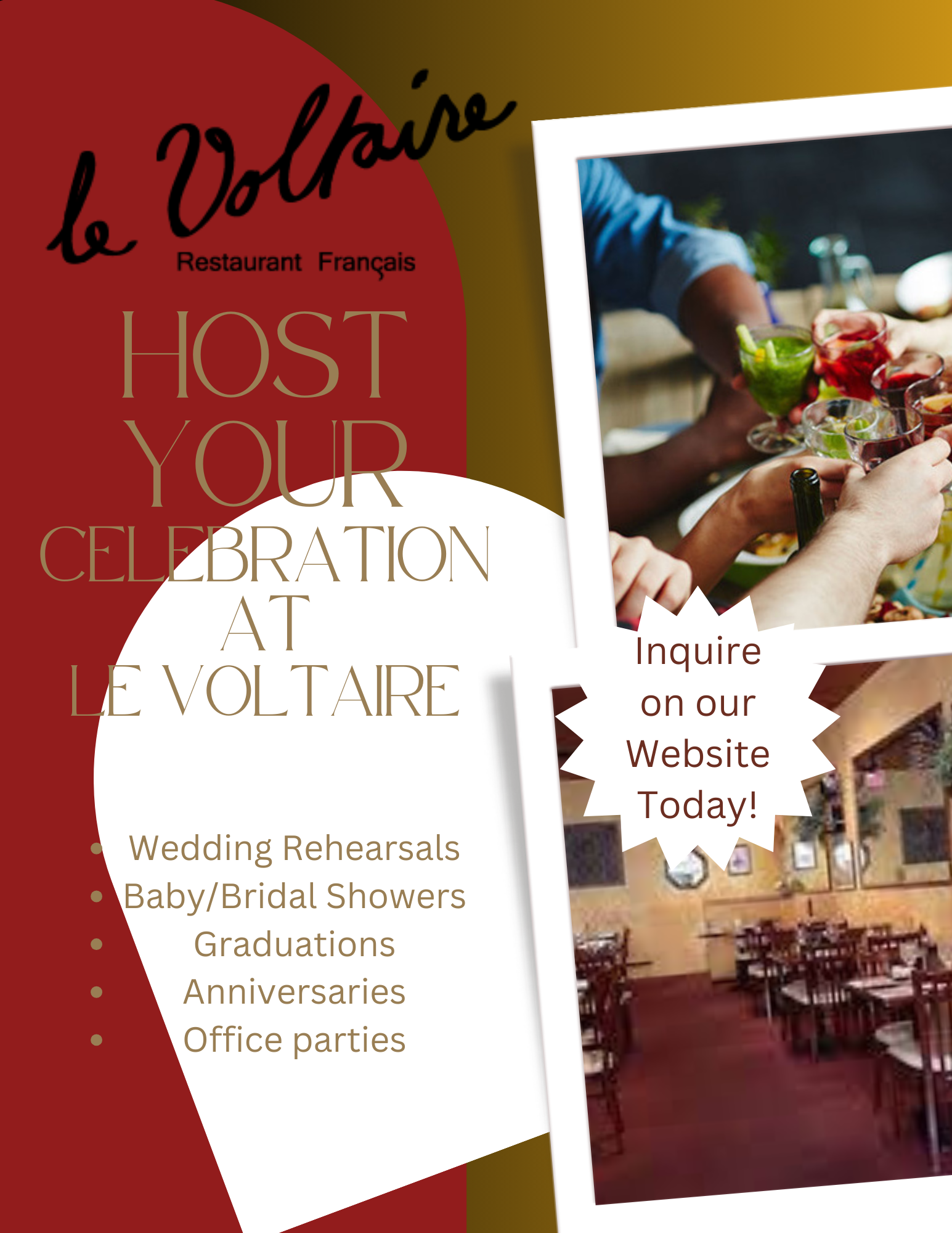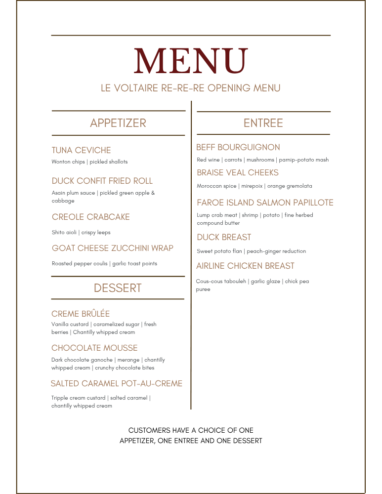Opened in 2001 by Cedric and Desarae Fichepain, Le Voltaire has been a staple in the fine dining community of Omaha. In August 2021 Wilson and Tonya Calixte became the new owners of the beloved establishment. After twenty years, we are excited to continue making the dishes that made us famous while adding new flavors and customers to the journey.